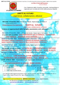 A partire dal 9 novembre 2022, nella sala Colombo della Regione Liguria, abbiamo organizzato, come Querce di Mamre Genova, una serie di incontri, che abbiamo chiamato “DIRITTI AL FUTURO“. La locandina pubblicata qua elenca tutti gli incontri previsti e i temi trattati.