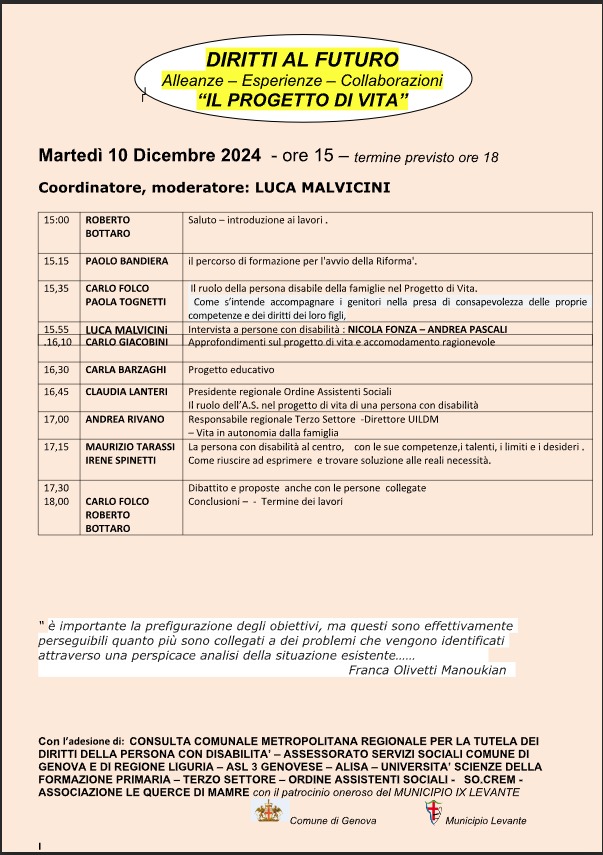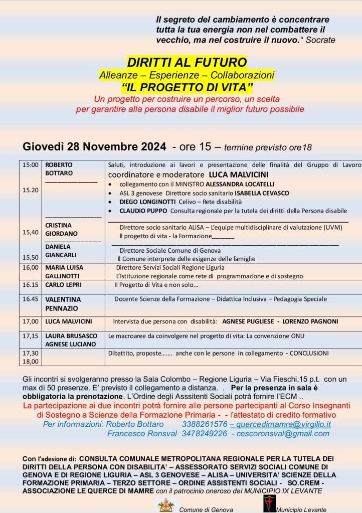 Si è tenuta, nella Sala Colombo della Regione Liguria, la seconda edizione del convegno DIRITTI AL FUTURO, organizzato dalle Querce di Mamre Genova. I due incontri sono stati l’ideale prosecuzione di quelli tenuti, nella stessa sede, nell’anno 2023.