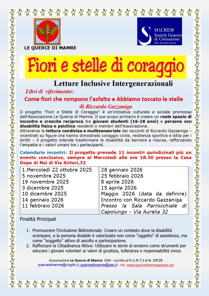 Grazie al patrocinio e al sostegno di SO.CREM – Società Genovese di Cremazione, dall’ottobre scorso questo percorso ha preso vita come un’esperienza continuativa, capace di mettere in relazione generazioni, vissuti e sensibilità diverse. Il contributo di SO.CREM rende possibile un cammino culturale e umano che valorizza la dignità, la memoria e i diritti di ogni individuo, trasformando la lettura in uno strumento concreto di inclusione, dialogo e crescita condivisa.
